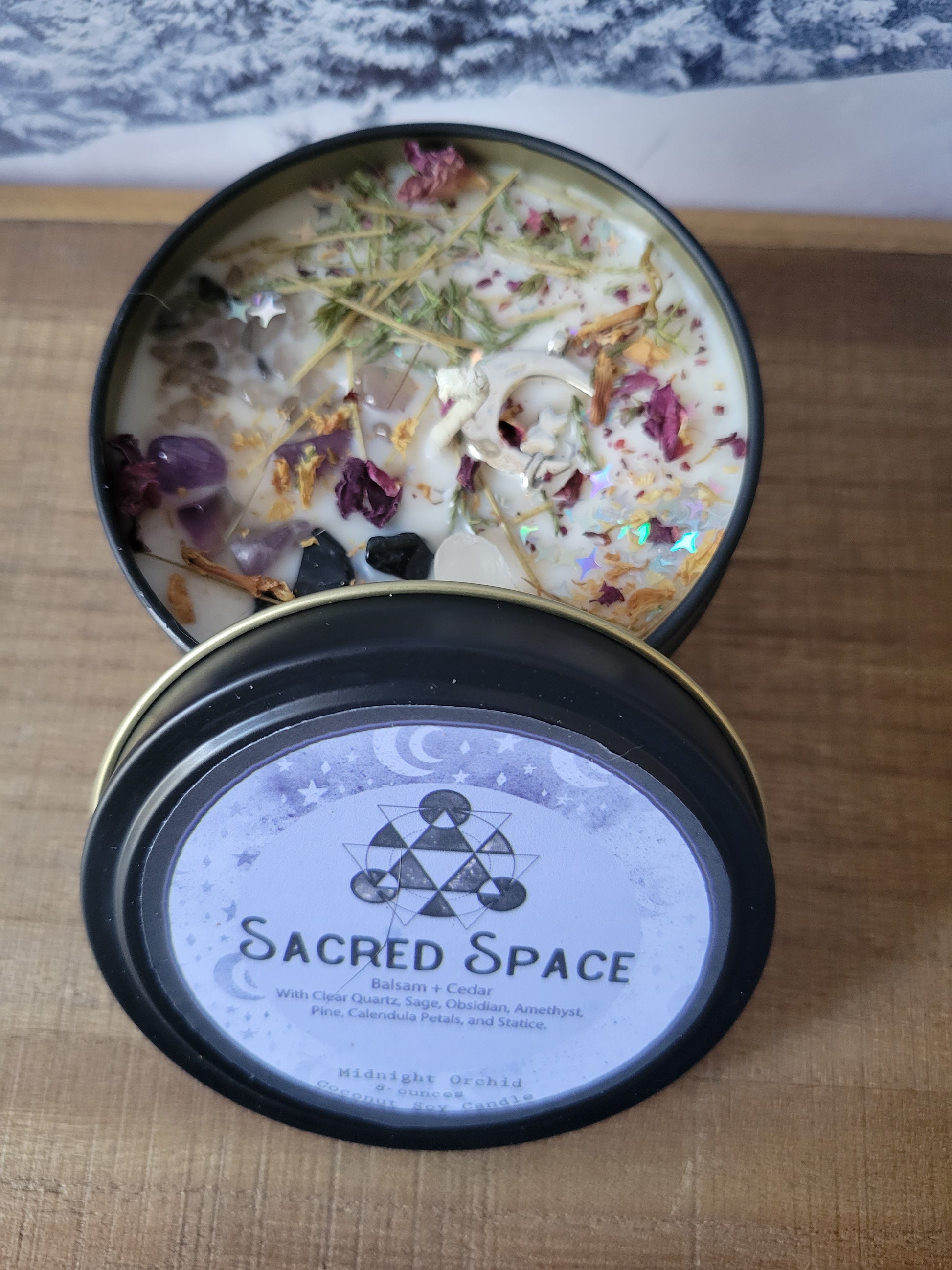Reclaim and cleanse your space with this lovely Sacred Space candle. This candle smells like fresh white pine and cedar with an earthy background. We dress this candle with white pine and cedar clippings, calendula, rose petals, Smoky quartz, Amethyst, and black tourmaline. A perfect and powerful combination for grounding, removing negative energy, opening or closing a ritual, and cleansing.